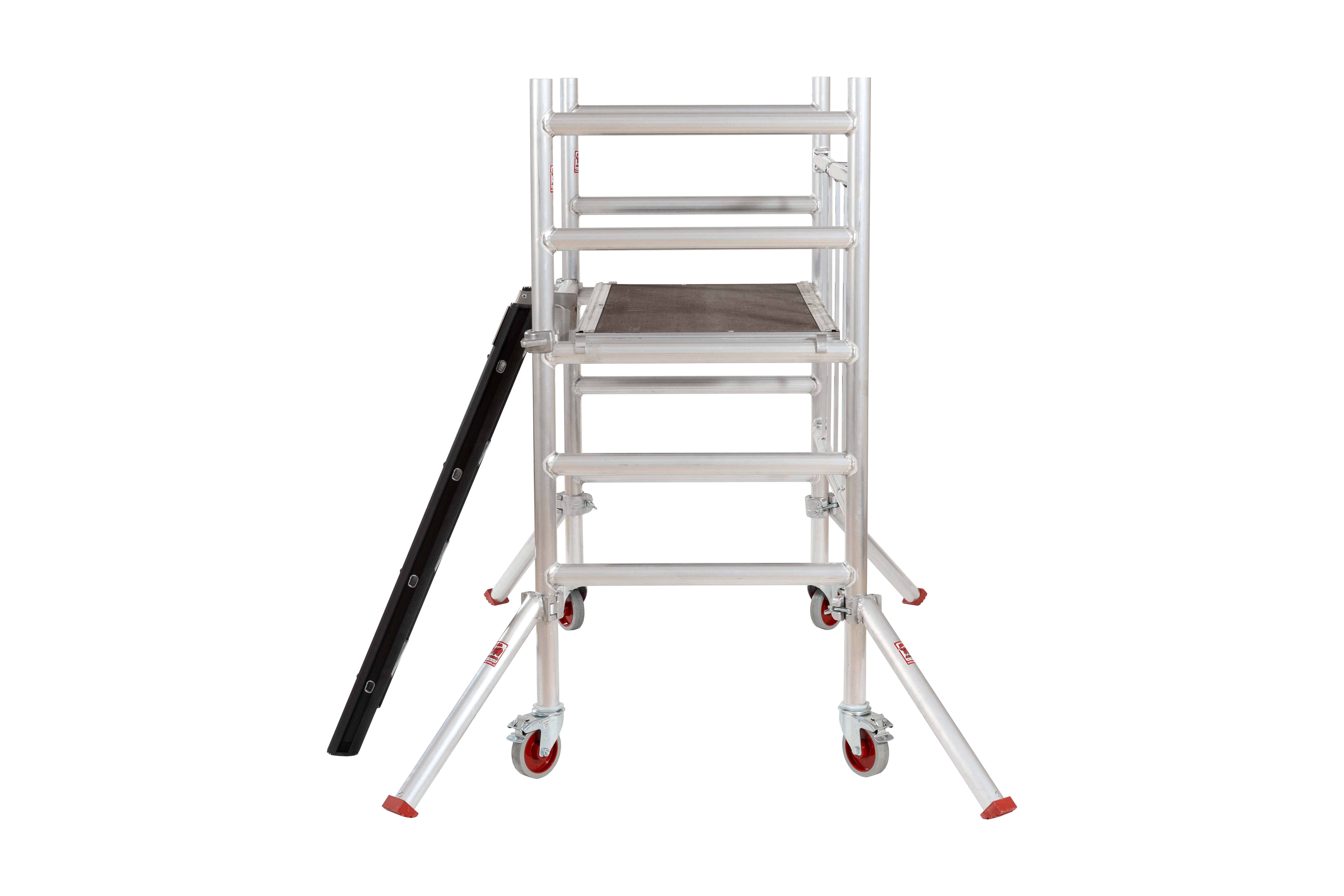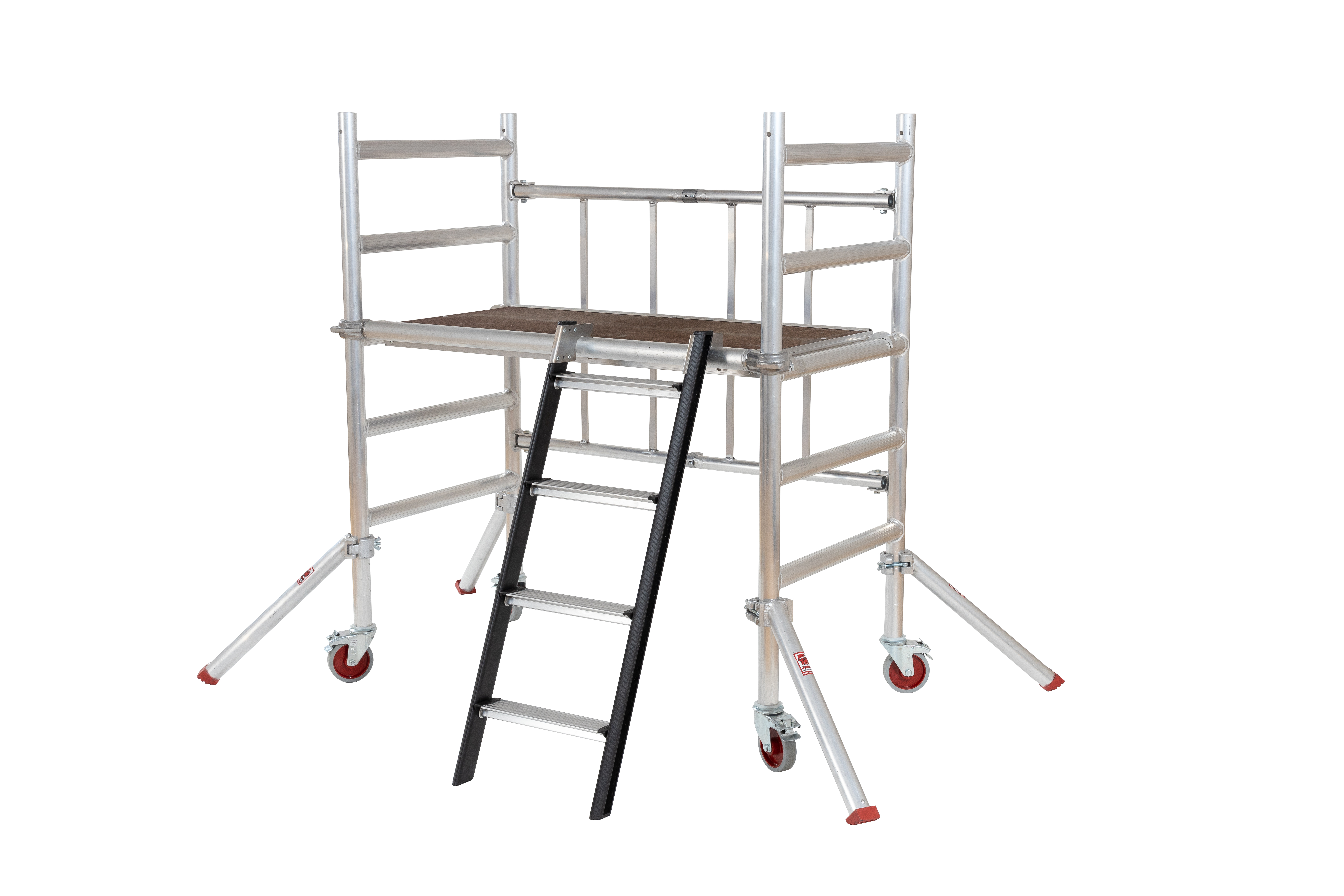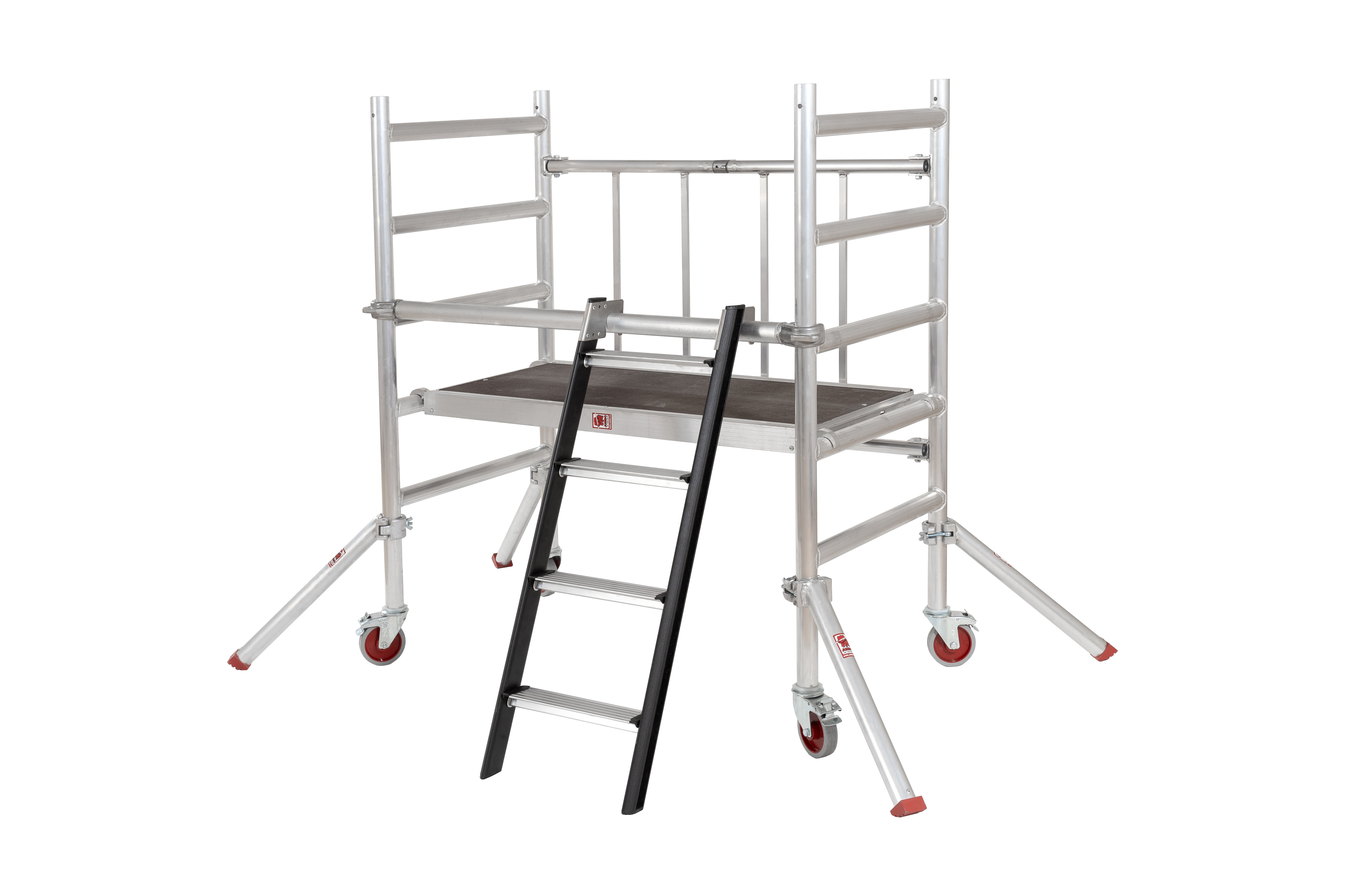 The foldable installation scaffold fits into a compact space. With four 0.5 m support legs, the Tikli Jumbo scaffold meets the stability requirements for work platforms set by Finnish Government Decree VNa 205/2009. The support legs enhance stability and safety. The set includes a safe access solution for lower heights: using the 4-step ladder, access is provided to platform heights of 0.75 m / 1 m by attaching the horizontal brace to the vertical frame of the scaffold and placing the 4-step ladder on the long side of the scaffold.