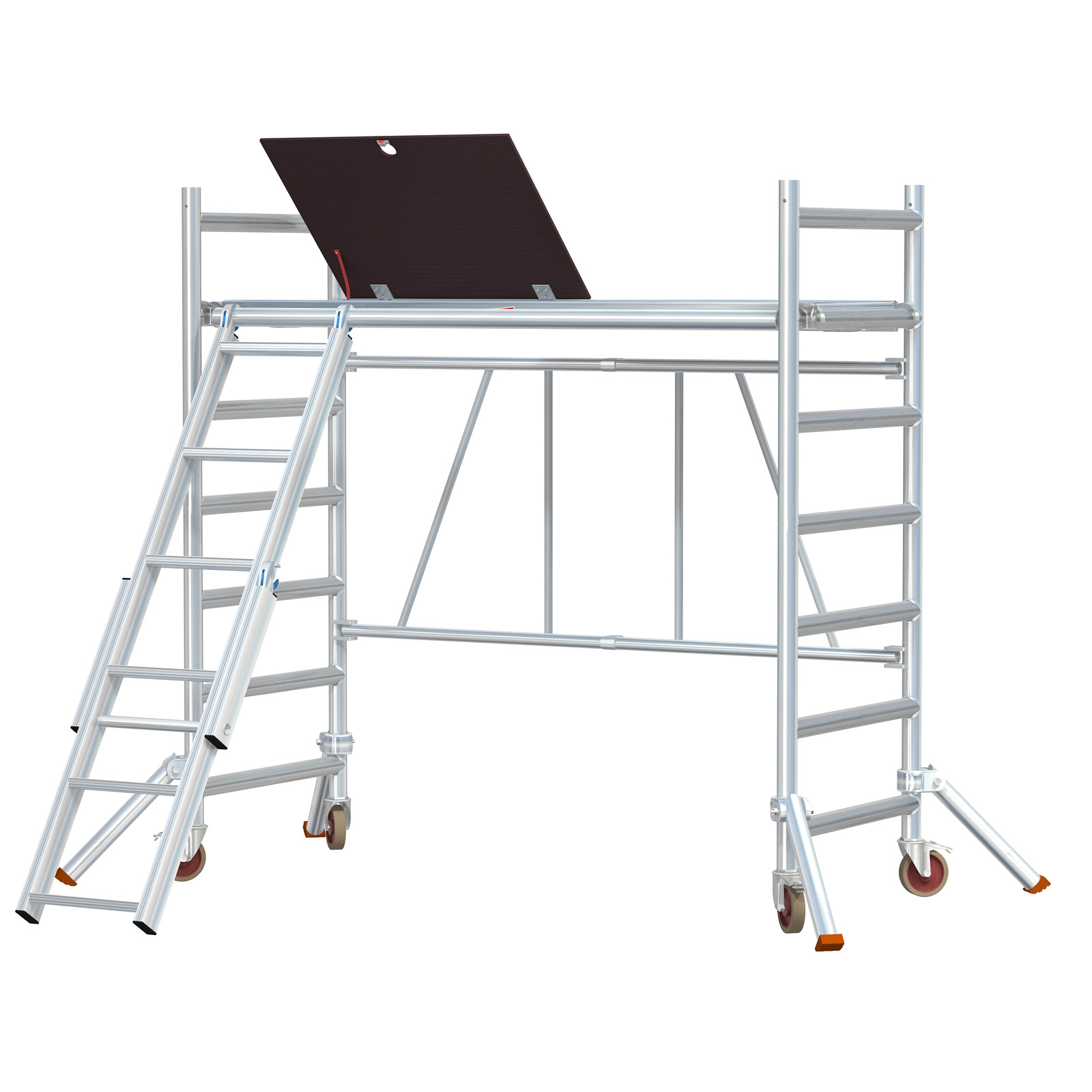 The scaffold is 74 x 178 cm wide without outriggers (working area 60 x 178 cm). The base section has a height of up to 1.8 meters and a working height of 3.8 meters.
