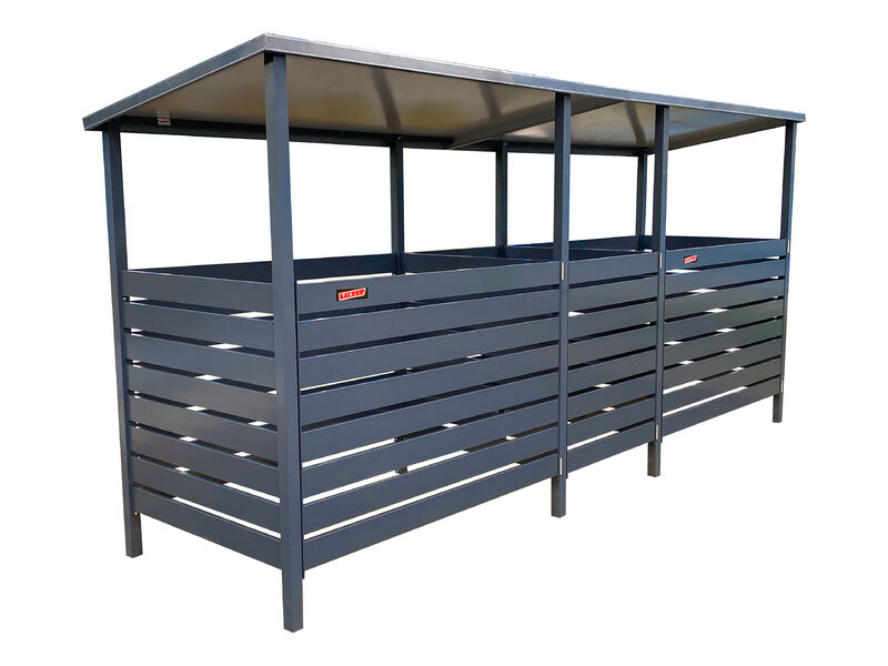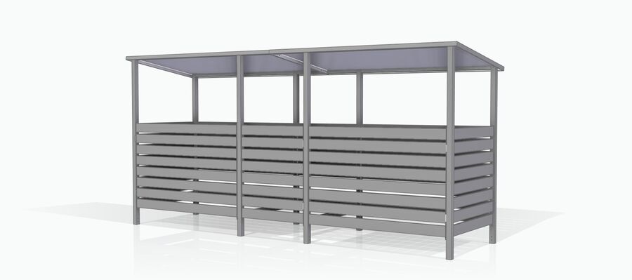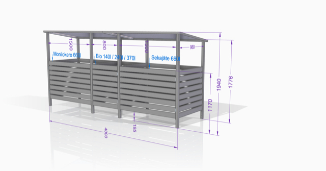 Tikli-roskakatos L+ on ovellinen roskakatos kahdelle 660-litraiselle jäteastialle ja yhdelle 140/240/370-litraiselle bioastialle. Roskakatos L+ soveltuu erityisesti taloyhtiöiden, yritysten tai julkisten tilojen pihoihin. Tyylikkäät katokset lisäävät piha-alueen viihtyisyyttä ja ovat turvallisia niin roskapussin viejälle kuin astian tyhjentäjällekin. Elementtirakenteen ansiosta katoksen voi pystyttää paikan päällä. Alumiininen roskakatos on kestävä, helppohoitoinen ja ekologinen ratkaisu jätehuoltotarpeisiin. Värinä tumman harmaa, ja ottamalla yhteyttä myyntiimme voit tilata katoksen myös muissa väreissä!