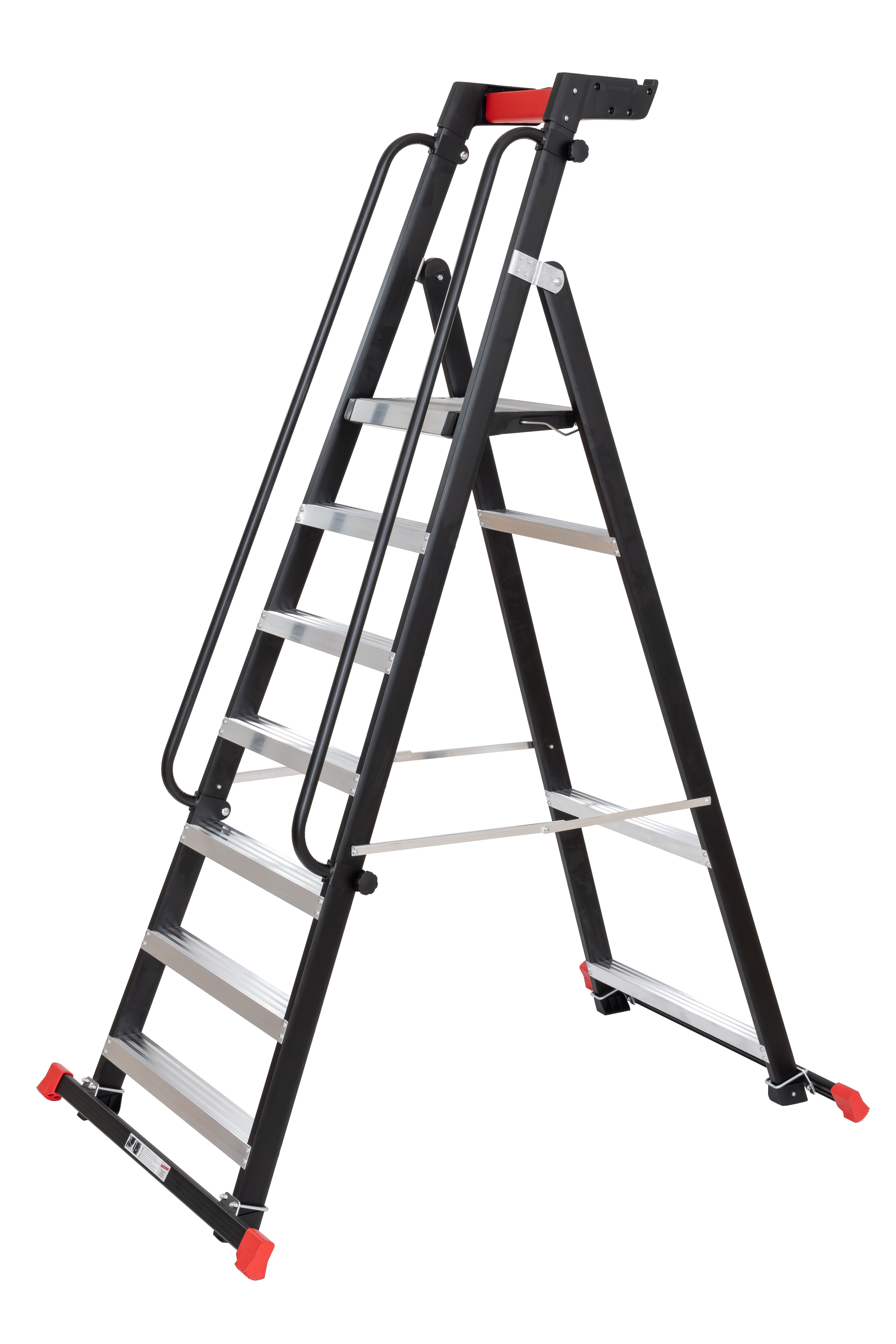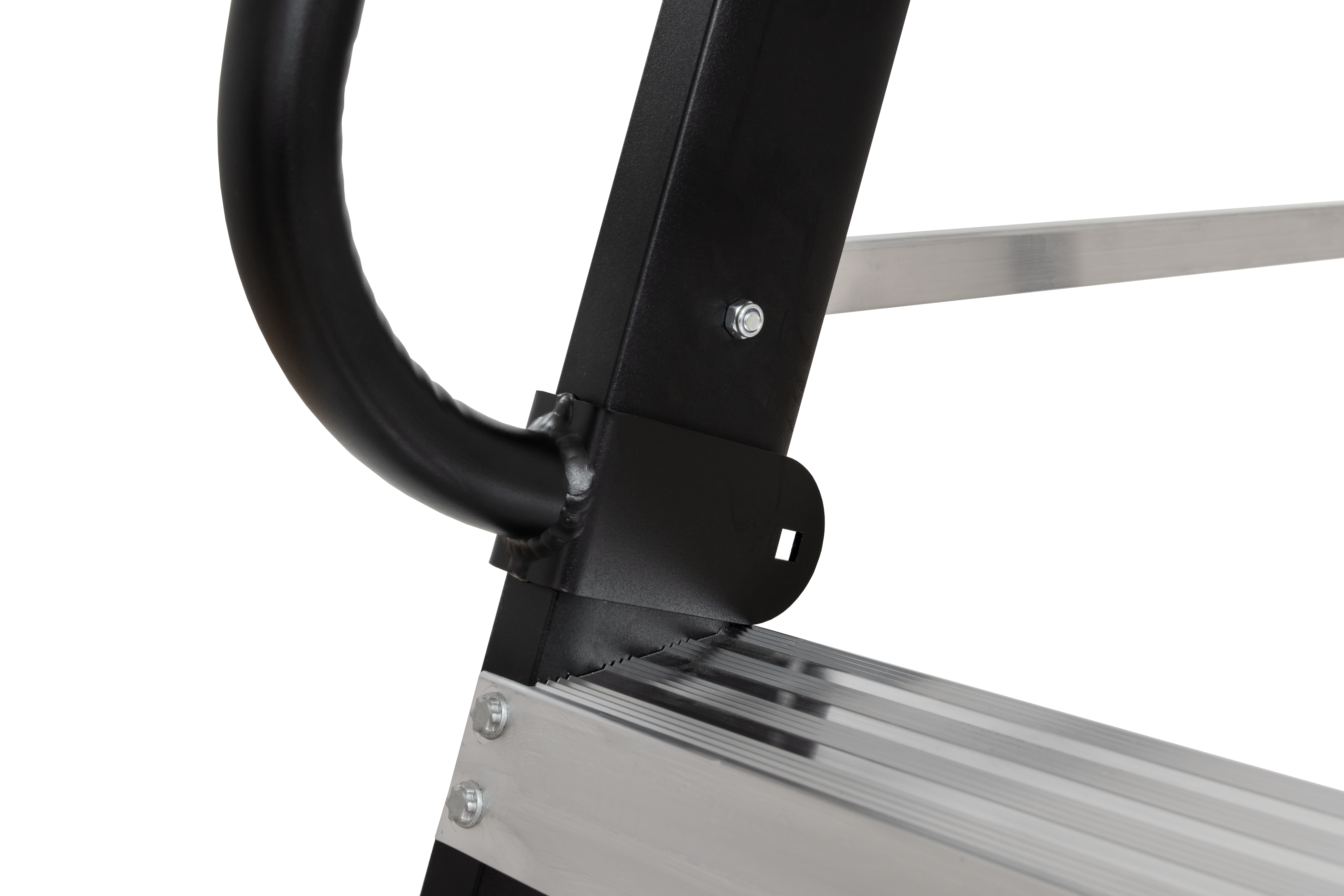 Vakaa ja tasokas ammattitasotikas vaativaan käyttöön. Uritettu, suuri alumiininen seisontataso (400 x 400) mm on suunniteltu soveltumaan myös kookkaammille turvakengille ja niiden käyttäjille tehden pitkäkestoisesta työskentelystä vakaampaa ja miellyttävämpää. Leveät uritetut askelmat on kiinnitetty kestävällä liitostekniikalla FDS- kitkahitsausruuveilla (Flow Drilling Screws). Uusi liitostekniikka takaa rakenteelle pitkän käyttöiän ja yhdessä sivuprofiileiden levenevän harituksen sekä vaakatukien kanssa tasotikas on erittäin vakaa käyttää. Korkea käsituki, tilava alumiininen työkalukotelo sekä ergonominen työskentelyasento lisäävät myös työturvallisuutta. Musta struktuurimaalipinta on siisti käsitellä, ei sotke käsiä. Liukuesteissä on huomioitu erinomainen kitka ja kulutuskestävyys, tassut ovat myös helposti vaihdettavissa.
